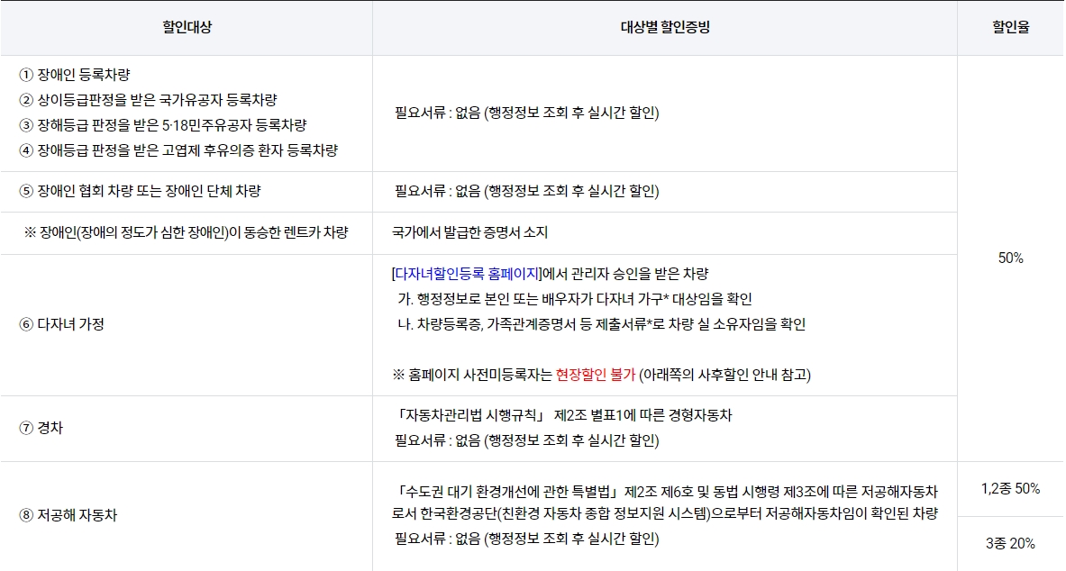 경차 | 필요서류 없음(조회 후 실시간 할인) | 1,2종 50% |
