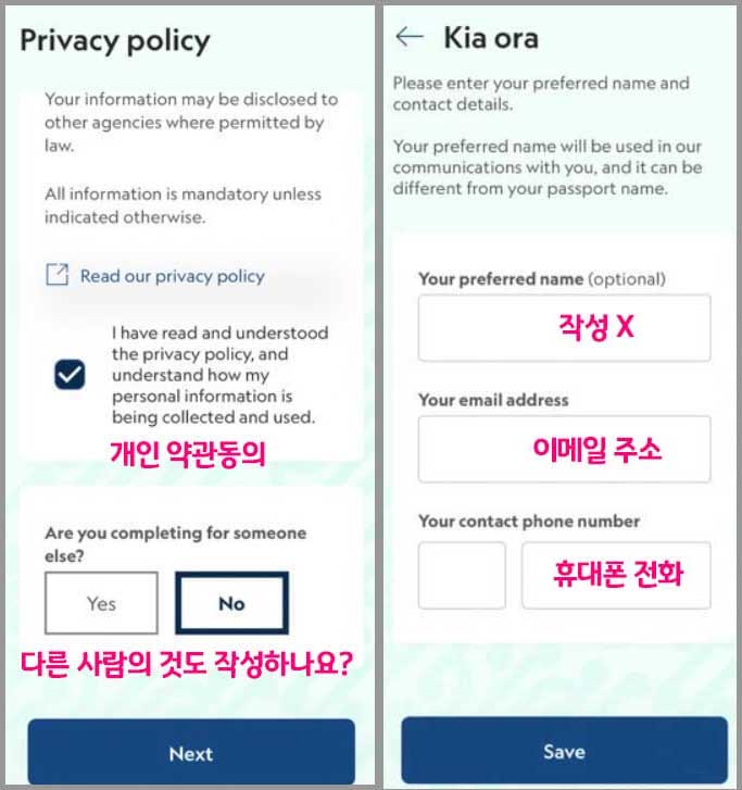 개인정보 사용에 대한 동의 후 정보를 입력합니다. 다른 사람의 것도 작성하고 있다면 Yes, 아니라면 No를 입력합니다. 뉴질랜드 입국신고서는 다른 사람의 것도 작성할 수 있습니다.