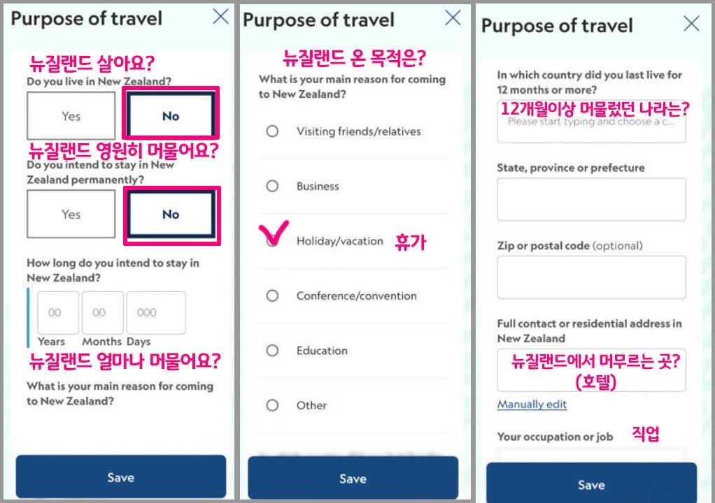 뉴질랜드를 방문한 목적에 대한 질문사항입니다. 여행을 목적으로 온 사람들이 많으므로 위의 내용을 참고하시면 됩니다. 여행목적은 '휴가' 방문기간, 호텔, 직업 등을 입력합니다.