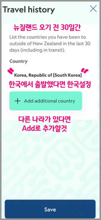 뉴질랜드를 방문하기 전 30일 동안의 여행기록에 대한 질문입니다. 환승하는 국가를 포함해서 적으면 됩니다. 직항이라면 그대로 두시면 되고 환승 또는 방문한 국가가 있다면 Add를 클릭해 추가하시면 됩니다.