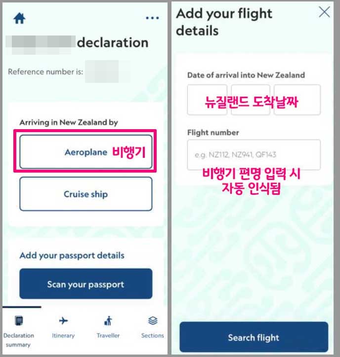 뉴질랜드 도착날짜와 비행기 편명을 입력합니다.