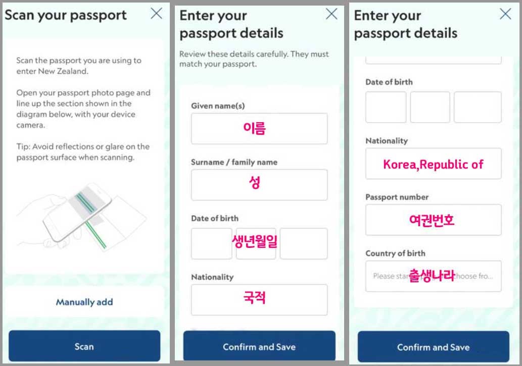 여권 첫 번째 페이지를 스캔하면 자동으로 입력됩니다. 여권을 스캔하지 않을 경우' Manually add'를 클릭하여 차례로 직접 입력하시면 됩니다. 이름 성, 생년월일, 국적, 여권번호, 출생 나라를 입력합니다. 출생국가는 Korea를 검색합니다.