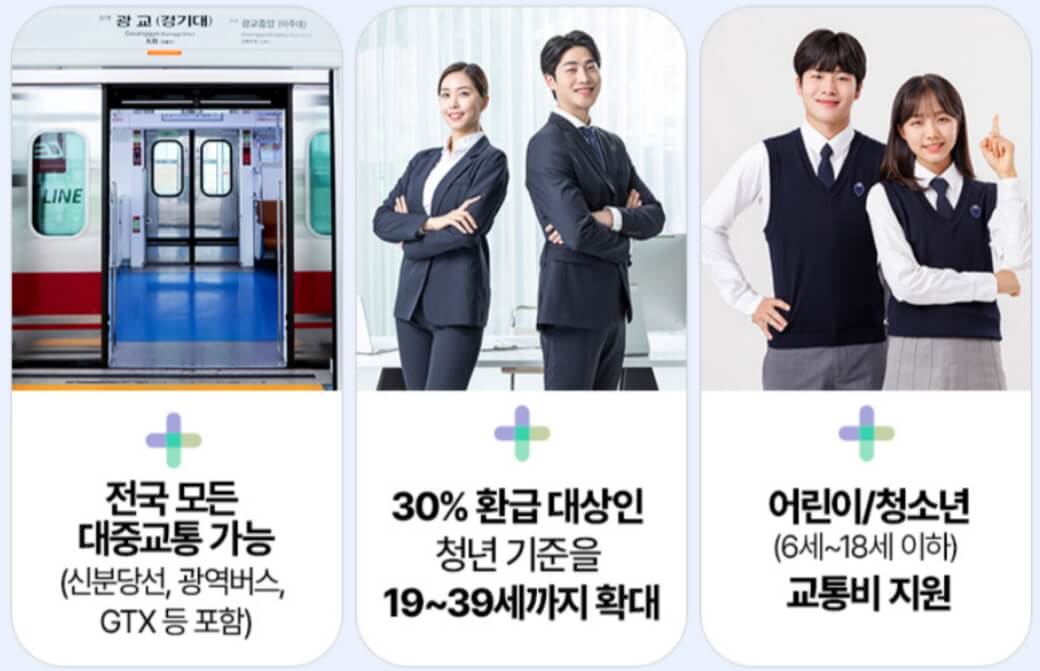 | 교통수단 | 전국 모든 교통수단 | 서울시내 전철, 버스 | 전국 모든 교통수단 (광역버스, 신분당선,GTX) |