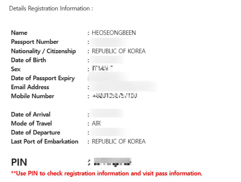 메일함에 들어가면 위의 내용의 메일이 보입니다. 중요한 것은 PIN번호인데 입국심사 시 확인할 수 있으니 캡쳐나 출력을 하시는게 좋습니다. 그외 PDF파일로 저장을 하셔도 됩니다.