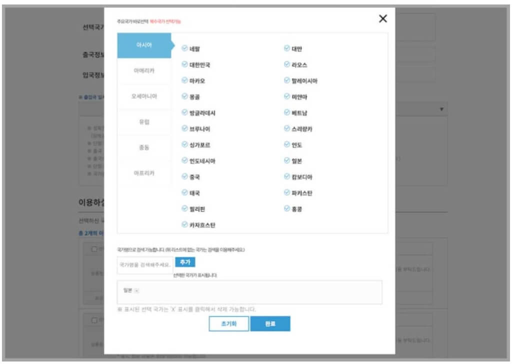 아시아, 아메리카, 오세아니아, 유럽, 중동, 아프리카 등 대륙별로 나라를 선택할 수 있습니다. 나라를 선택했다면 출국, 입국정볼 입력합니다.