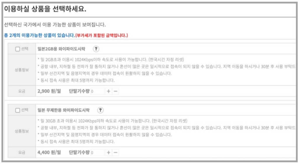 요금제는 1일 , 무제한으로 선택이 가능합니다. 일본의 경우 하루 2G와 무제한 중 선택할 수 있습니다.