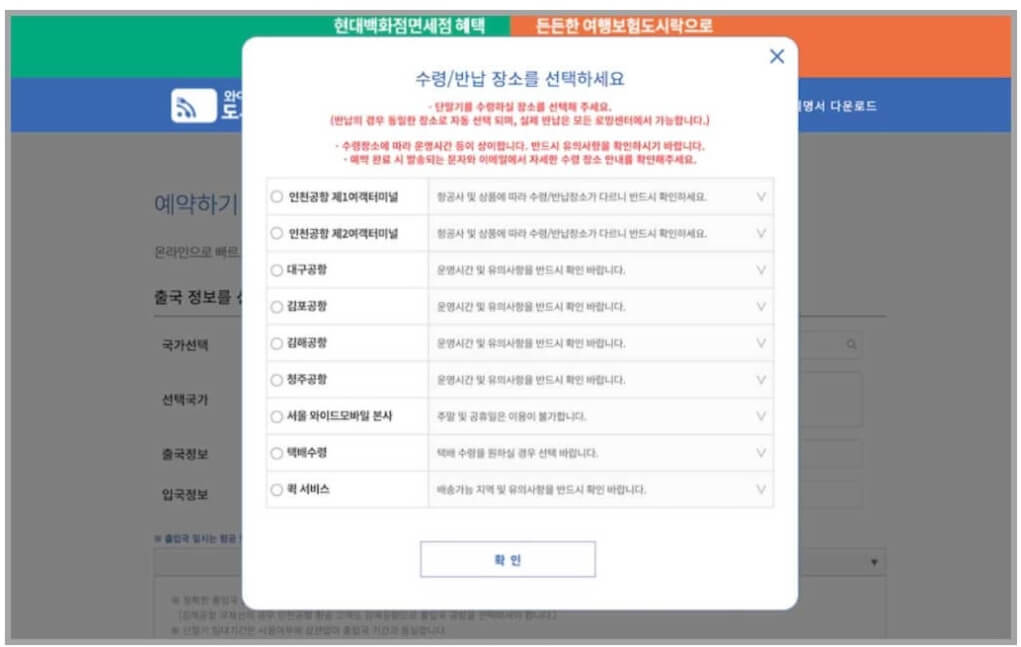 와이파이도시락을 수령, 반납하는 장소를 선택합니다. 반납은 수령했던 장소에서 반납하시면 됩니다. 출국 당일 공항에서 수령하므로 공항을 잘 확인 후 데이크 위치를 미리 파악하는 게 좋습니다.
