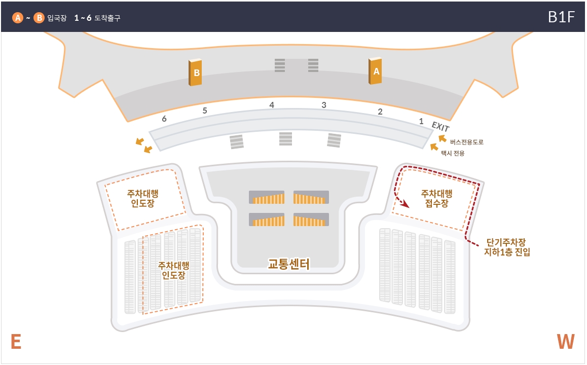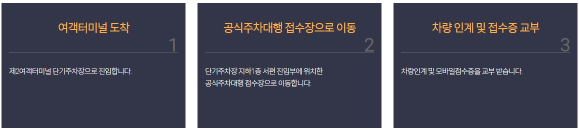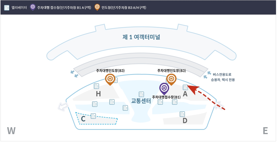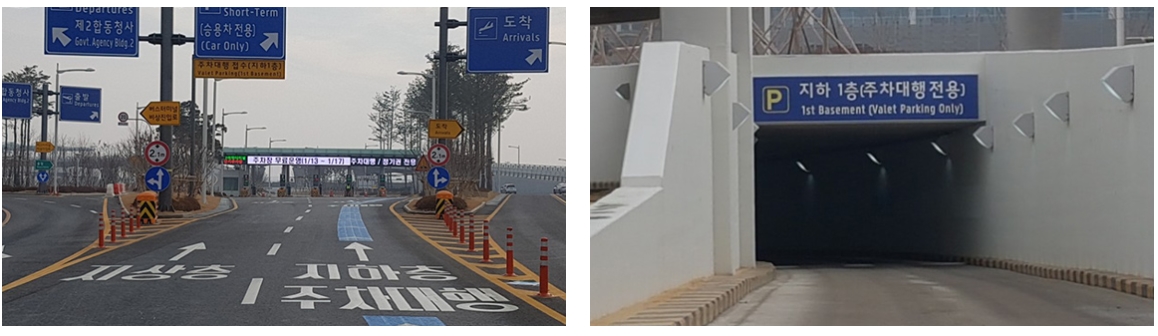 - 터미널 진입 시 주차대행 전용차선으로 진입(파란색 바닥라인 표시)