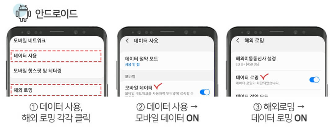 3. 해외로밍 > 데이터 로밍 켭니다.