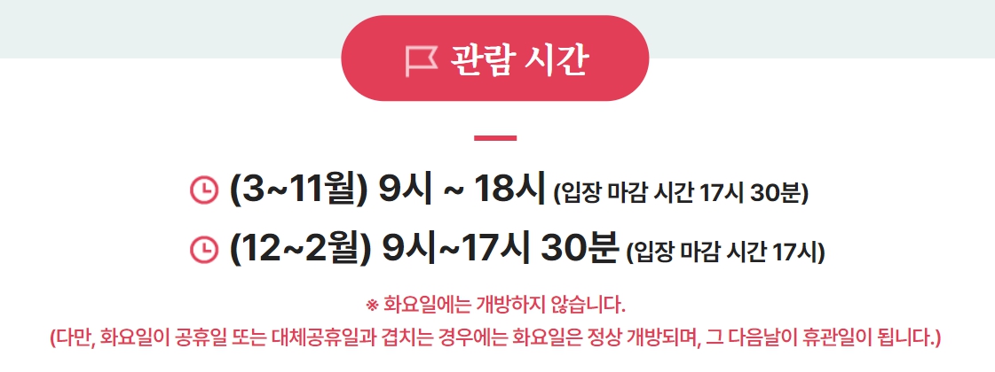 - 12월~2월 : 오전 9시 ~ 오후 5시 30분 (입장마감 오후 5시)