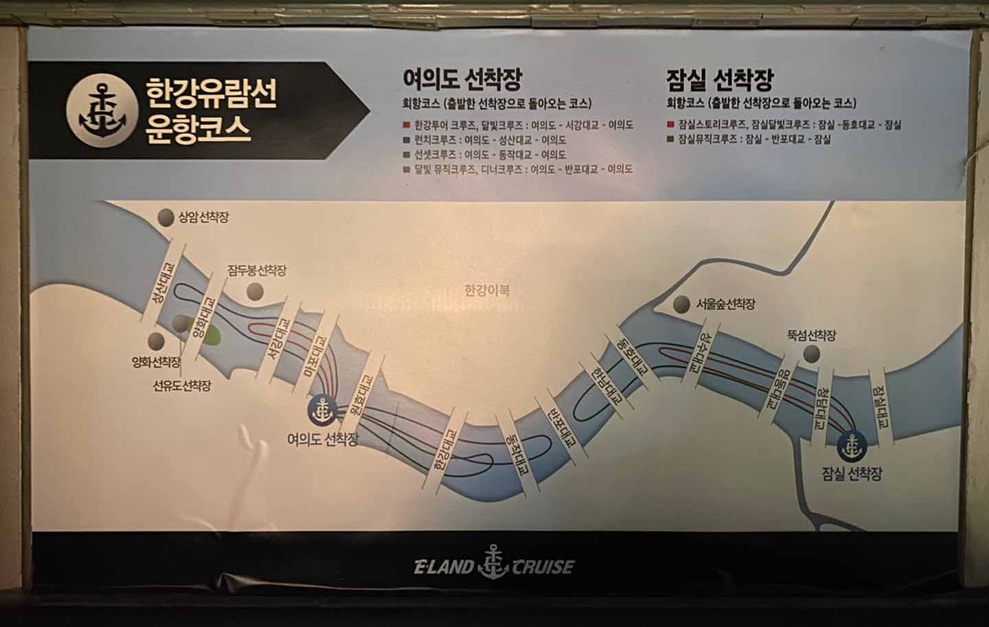 한강유람선을 타는 곳은 여의도와 잠실 두 군데 있습니다. 최근에는 잠실에서는 유람선을 탈 수 없습니다. 여의도 선착장을 이용하시면 됩니다.