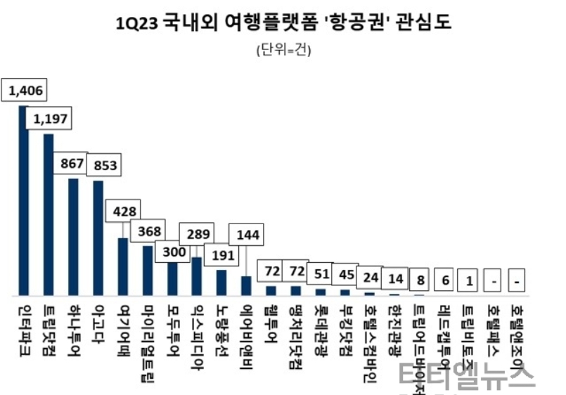 인터파크는 1분기 '항공권'관련 포스팅 수 1,406건으로 관심도 1위를 차지했습니다. 그만큼 많은 사람들이 이용했다는 증거입니다. 인터파크의 뒤를 이어 트립닷컴, 하나투어, 아고다, 여기 어때 등이 있습니다. 여행 후기를 보면 인터파크 투어에서 가장 저렴한 항공권을 구매했다는 글이 많았습니다. 홈페이지가 직관적이고 담당자가 빠르고 친절하게 응대를 해서 만족도가 높다고 합니다.